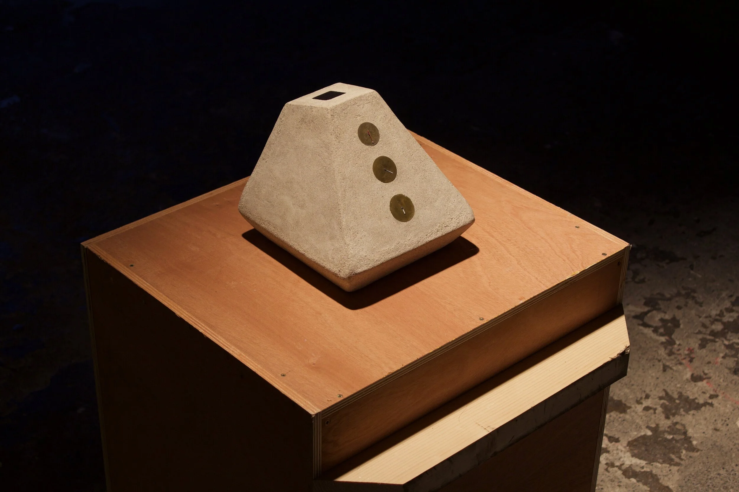 Untitled (Pyramid 1), 2019, photovoltaic cell, watch mechanisms, wire, solder, filler, sand, glue, resin, stone, wood, plaster, height approx. 19cm